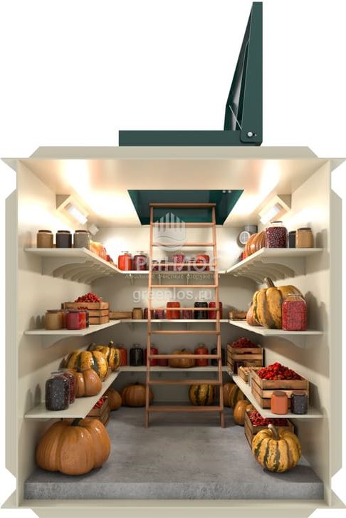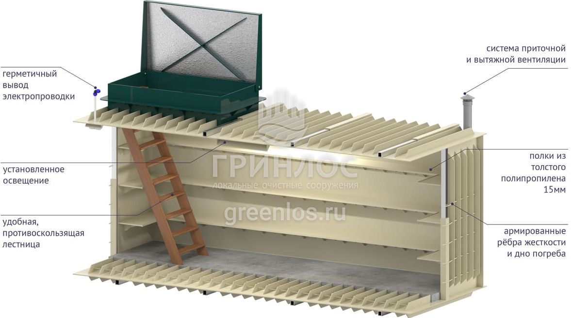 Для функциональной эксплуатации Гринлос Погреб Погреб ЛК 5000*2000*2000 оборудован приточной и вытяжной вентиляцией, освещением, полками, лестницей, крышкой.