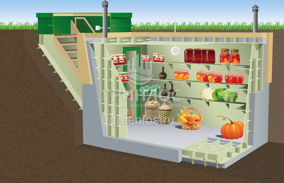 «ГРИНЛОС Погреб» представляет собой заглубленное герметичное техническое помещение габаритами 4.5х2х2 м. Устройство поставляется в полной заводской готовности для круглогодичного хранения продуктов питания – овощей, солений и др. домашних запасов.