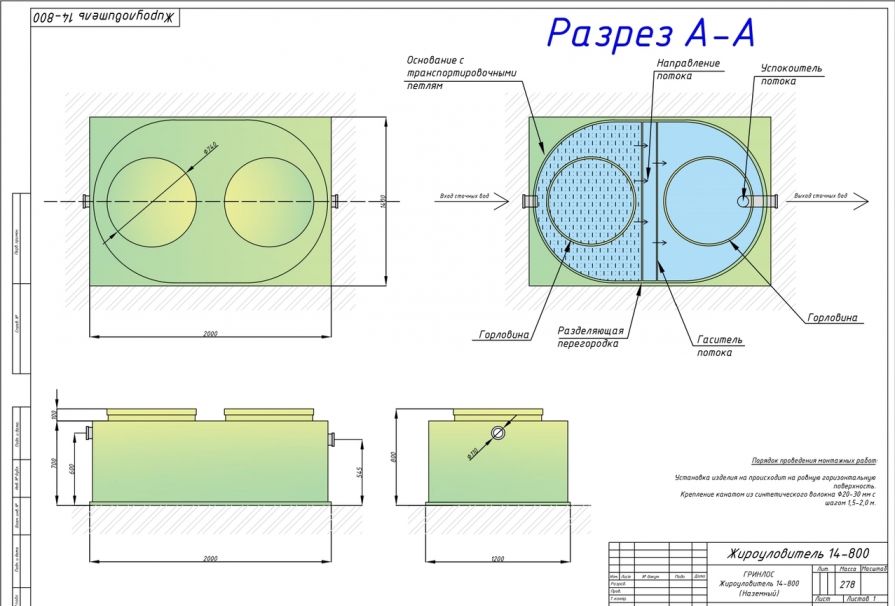 Гринлос Жироуловитель 14-800 Горизонтальный Наземный ставят в технические, подвальные помещения. Требуется, чтобы к ним был организован удобный подход, подъезд, чтобы проводить эксплуатацию, подключение к производственной канализации.