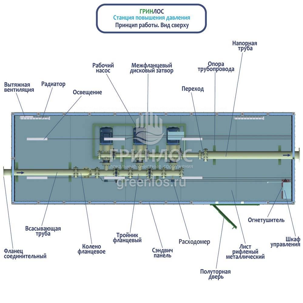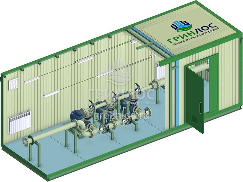 Конструкция насосной станции повышения давления воды Гринлос НСПД 40-100 включает утепленный контейнер с вентиляцией, радиаторами и освещением, обеспечивающими оптимальные условия эксплуатации оборудования. Шкафы управления, размещенные на стенах контейнера, контролируют работу системы в автоматическом режиме, регулируя параметры давления и производительности насосов.