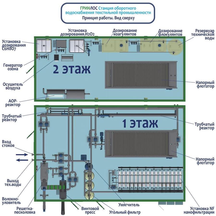 Станции очистки сточных вод легкой промышленности, предназначенные для стоков текстильных производств, представляют собой многоступенчатую систему механико-физико-химической очистки. Основные узлы включают блок предварительной фильтрации, реактор смешения реагентов, флотатор с системой дозирования воздуха и реагентов, а также шламосборное и обезвоживающее оборудование.